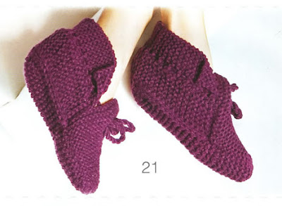 Верхняя часть: набрать 5 петель и вязать платочной вязкой. Тем временем, с каждой стороны от центральной петли прибавлять в каждом 2 р. 14x1 п; для прибавления до центральной петли выполнять накид, 1 центральная петля и затем другой накид = всего 33 петли. Закрыть прямо все петли. Сшить задний шов. Сшить ступню, оставив боковую часть, сложить край этой части и закрепить носок невидимым швом (см. фото). Создать шнурок из 2-х нитей длиной 80 см; начиная от середины ступни, протянуть шнурок через ажурный ряд с каждой стороны и завязать в центре.